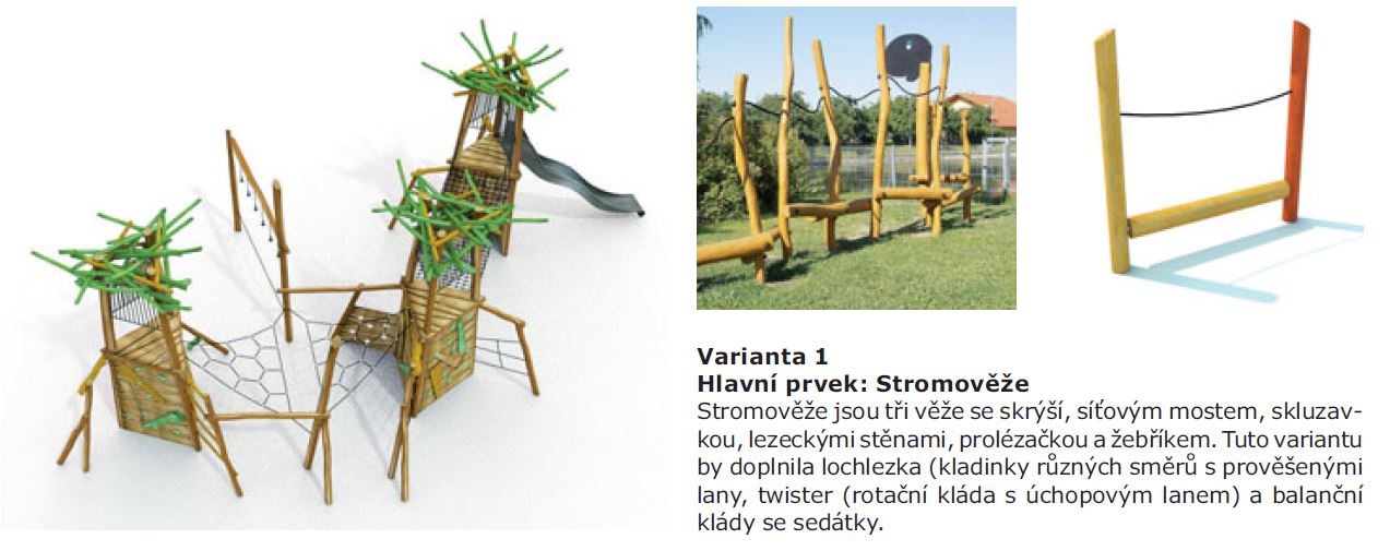 Ve hře jsou tři varianty, vždy jeden ústřední velký herní prvek - stromověže (1), velryba (2) či pirátská loď (3) - a k nim několik menších dřevěných prvků, které budou na druhé straně přes chodník u hřiště na pétanque.